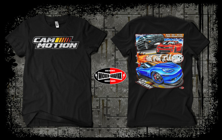 Cam Motion t-shirts featuring a 3 car design: (1 Corvette, 1 Camaro and 1 Firebird) on the back and the Cam Motion logo on the front. FREE SHIPPING.